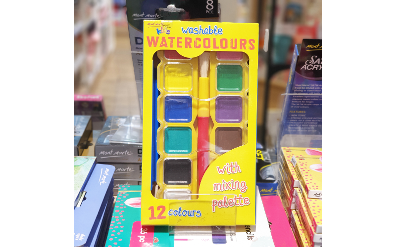 อาจเริ่มต้นจากชุดสีน้ำเล็กจากแบรนด์ Mont Marte ที่สามารถล้างออกได้ไม่ต้องกลัวเลอะ มีทั้งหมด 12 สีในบล็อกแยก ใช้งานง่าย มาพร้อมพู่กันให้ลองแต้มสี ผสมสีได้ตามชอบ ทำจากสีปลอดสารเคมี หมดห่วงเรื่องอันตราย