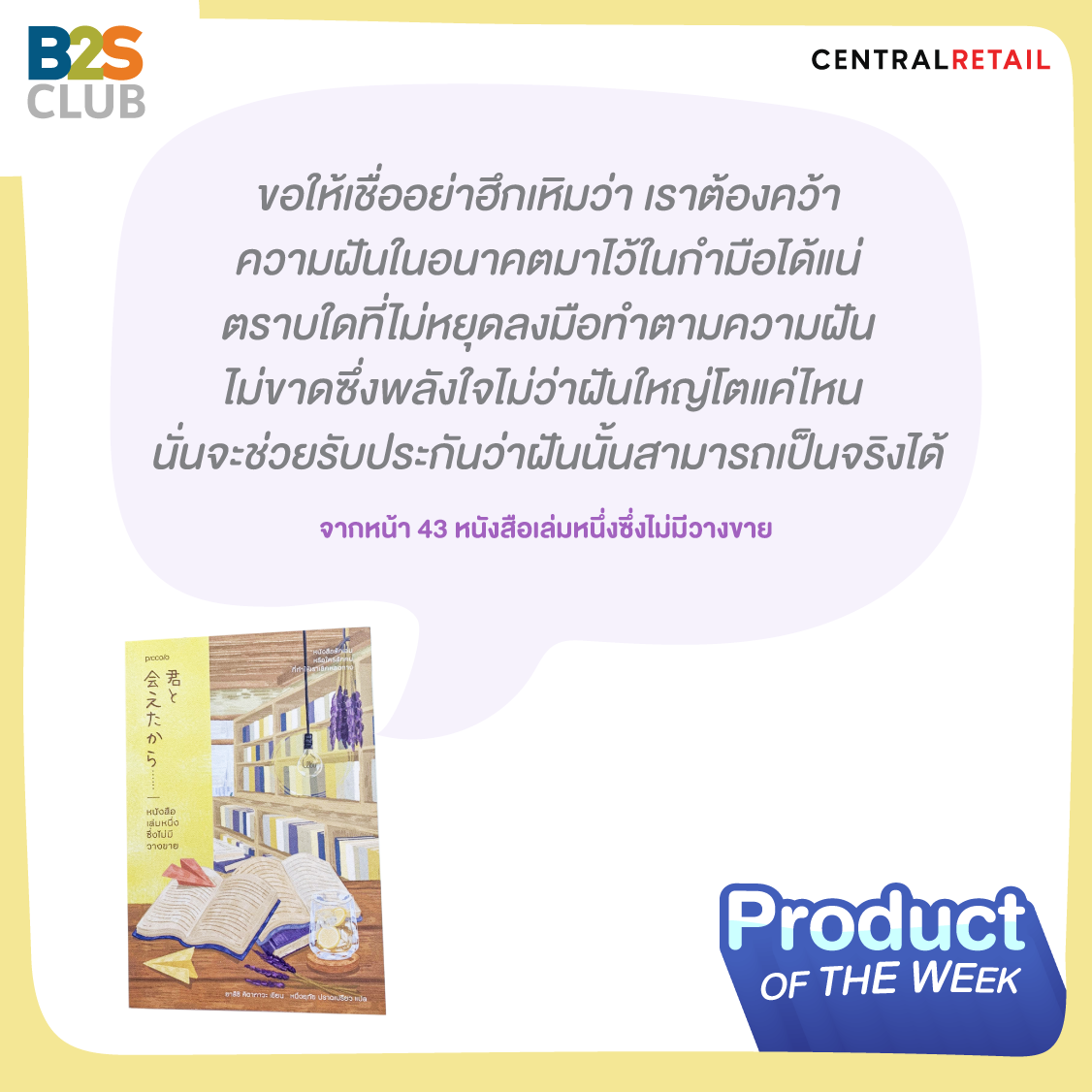 What: ชื่อหนังสือ “หนังสือเล่มหนึ่งซึ่งไม่มีวางขาย” หนังสือนิยายแปลจากภาษาญี่ปุ่นที่ขายไปแล้วกว่า 120,000 เล่มในญี่ปุ่น จากสำนักพิมพ์ Piccolo ราคา 225 บาท เขียนโดย ยาสึชิ คิตากาวะ แปลเป็นภาษาไทยโดย หนึ่งฤทัย ปราดเปรียว หน้าปกโปรยว่า “หนังสือสักเล่ม หรือใครสักคนที่ทำให้เราเลิกหลงทาง”