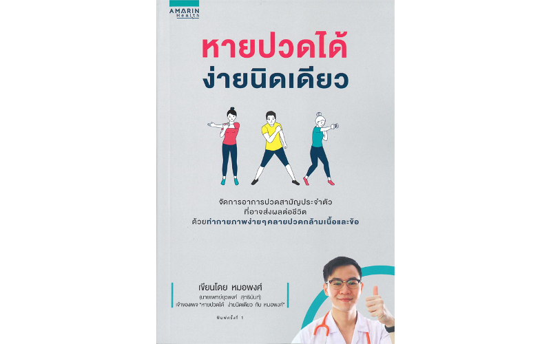 "หายปวดได้ ง่ายนิดเดียว" เป็นหนังสือที่บอกเล่าอาการปวดบริเวณต่างๆ ของร่างกายว่าเกิดมาจากสาเหตุหรือโรคอะไร พร้อมแนะนำเทคนิคการบริหารเพื่อบรรเทาอาการปวดเหล่านั้นทั่วร่างกาย รวมถึงได้รวบรวมท่าบริหารเพื่อให้ร่างกายกลับมาฟิตแอนด์เฟิมอีกครั้ง นอกจากนี้ยังมีท่าออกกำลังกายง่ายๆ สไตล์คนไม่มีเวลา แค่นั่ง นอน ยืน เดิน ก็เป็นท่าออกกำลังกายได้แล้ว ภายในเล่มยังมีตัวอย่างคอร์สออกกำลังกาย ทำง่าย ได้ผลเร็ว ท้ายสุดมีการรวบรวมคำถาม-คำตอบ ที่หลายคนสงสัยเกี่ยวกับอาการปวดและที่เกี่ยวข้องแต่ไม่มีโอกาสถามหมอมาช่วยคลายข้อสงสัยไว้ให้อีกด้วย คลิกสั่งซื้อ https://bit.ly/3ie8brh