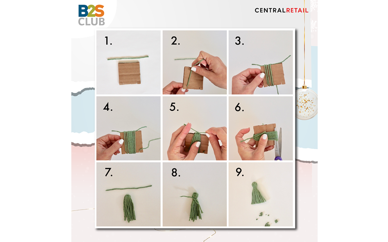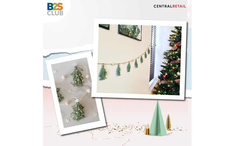 นำพู่ที่ทำไว้ทั้งหมดมาผูกเข้ากับเชือกเส้นยาว และเว้นระยะเท่า ๆ กัน ร้อยลูกปัดหรือติดของตกแต่งเพิ่มเข้าไประหว่างพู่คริสต์มาส เพื่อเพิ่มความสวยงามได้ตามใจชอบเลย เท่านี้ก็จะได้ของตกแต่งคริสมาสแบบน่ารัก ๆ ไว้ประดับห้องเราเพิ่ม ชาวคลับคนไหนทำแล้วอย่าลืมถ่ายรูปติด #B2Sclub มาอวดกันด้วยนะคะ ส่วนอุปกรณ์นั้นหาได้ไม่ยากเลย สามารถไปเลือกที่ร้าน B2S หรือสั่งออนไลน์ได้ที่ www.b2s.co.th