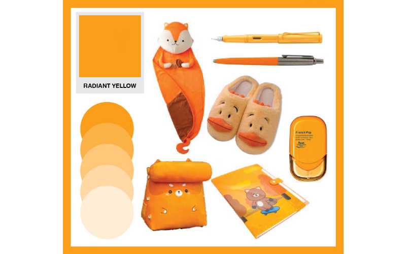 สีเหลืองส้ม Radiant Yellow หรือสีที่เหมือนมะม่วงสุก สีที่เพิ่มความมั่นใจและให้พลังบวกในจิตใจ สื่อถึงการมองโลกในแง่บวก ทำให้โลกสว่างสดใสเหมือนช่วงฤดูร้อน