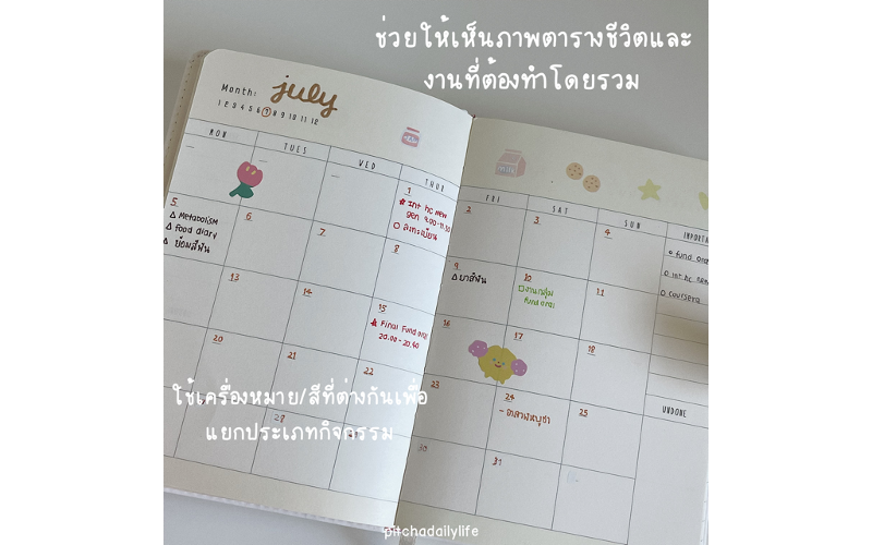 มาเริ่มกันเลย แบบแรกการเขียนแพลนเนอร์ที่เป็นตารางทั้งเดือน การเลือกใช้แพลนเนอร์แบบนี้จะช่วยให้เห็นภาพรวมของตารางกิจกรรมทั้งเดือน เราอาจจะใช้สีแดงในเรื่องที่จำเป็นต้องทำมากที่สุด สีส้มในเรื่องที่เรายังไม่แน่ใจ หรือใช้สัญลักษณ์ และเครื่องหมายในการแยกแต่ละกิจกรรม เช่น รูปเค้กวันเกิด รูปไม้แบดแทนวันที่เราจะไปตีแบดกับก๊วนเพื่อน เป็นต้น