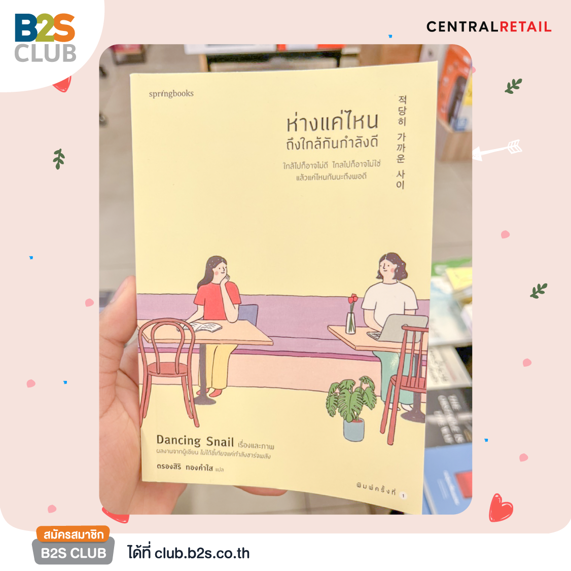 “ห่างแค่ไหน ถึงใกล้กันกำลังดี” ทุกความสัมพันธ์ระยะห่างคือเรื่องสำคัญ แต่จะห่างแค่ไหนถึงจะประคับประคองความสัมพันธ์ให้เติบโตได้อย่างงดงงาม หนังสือเล่มนี้คือคำตอบของความสัมพันธ์ทุกรูปแบบกับหนังเนื้อโดนใจ และภาพสวย ๆ จากผู้เขียนนามปากกา ‘Dancing Snail’ ที่จะพาคุณไปเรียนรู้ ยอมรับ และปรับตัวให้ทุกความสัมพันธ์สามารถดำเนินไปได้อย่างแข็งแรง ขยับอีกนิด เขยิบอีกหน่อย ให้เราใกล้กันกำลังดี คลิกดูรายละเอียด
