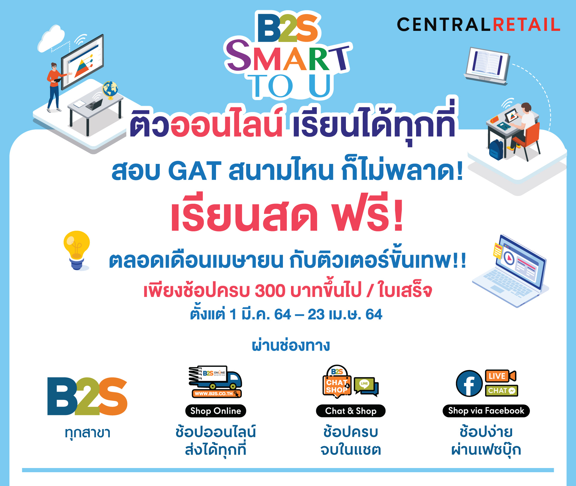 B2S SMART TO U ชวนติวออนไลน์ ซื้อสินค้าครบ 300 บาท รับสิทธิ์ติวฟรี เดือนเม.ย. ตลอดทั้งเดือน