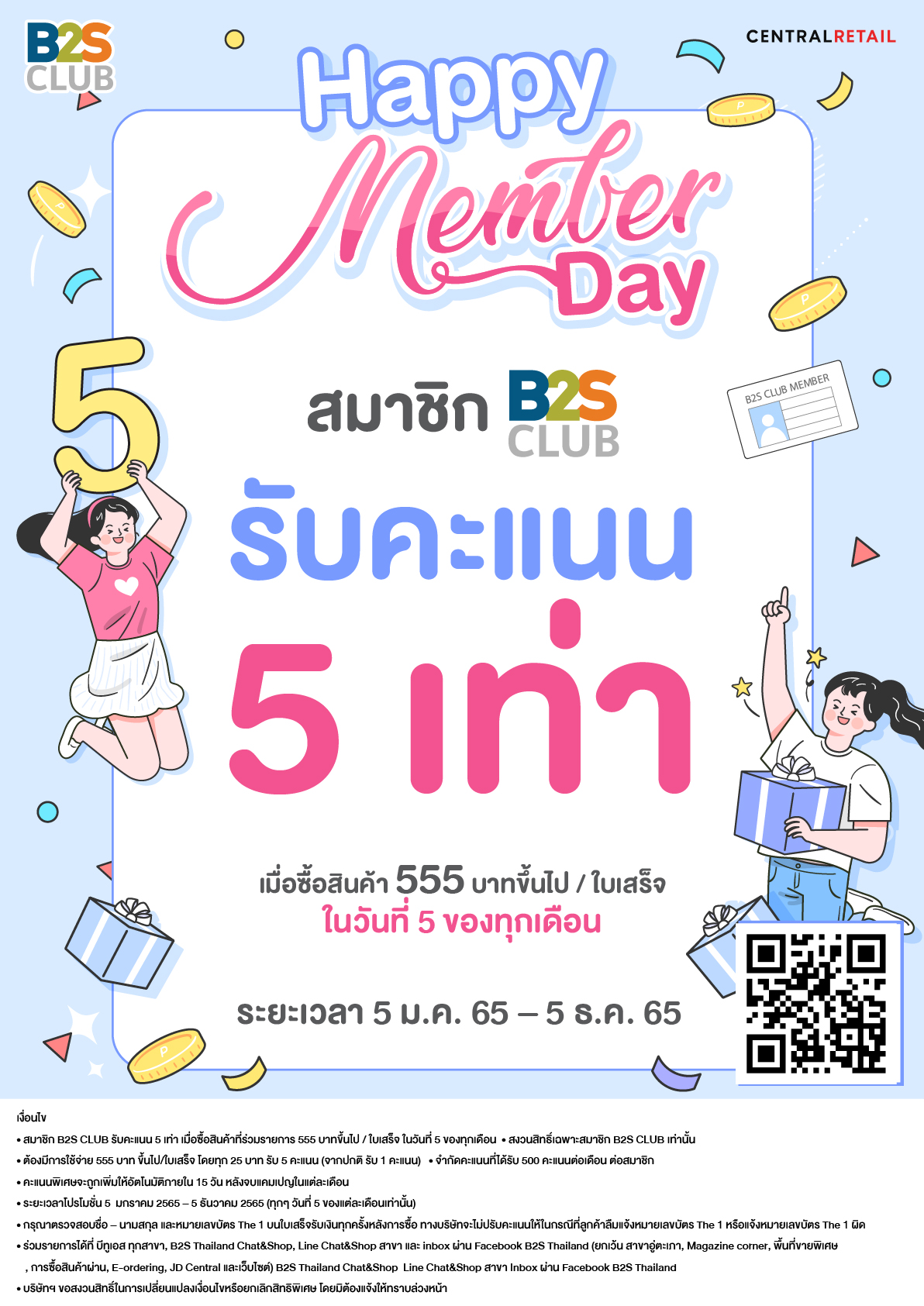 Happy Member Day สมาชิก B2S CLUB รับคะแนน 5 เท่า เมื่อซื้อสินค้าที่ร่วมรายการ 555 ขึ้นไป / ใบเสร็จ ในวันที่ 5 ของทุกเดือน