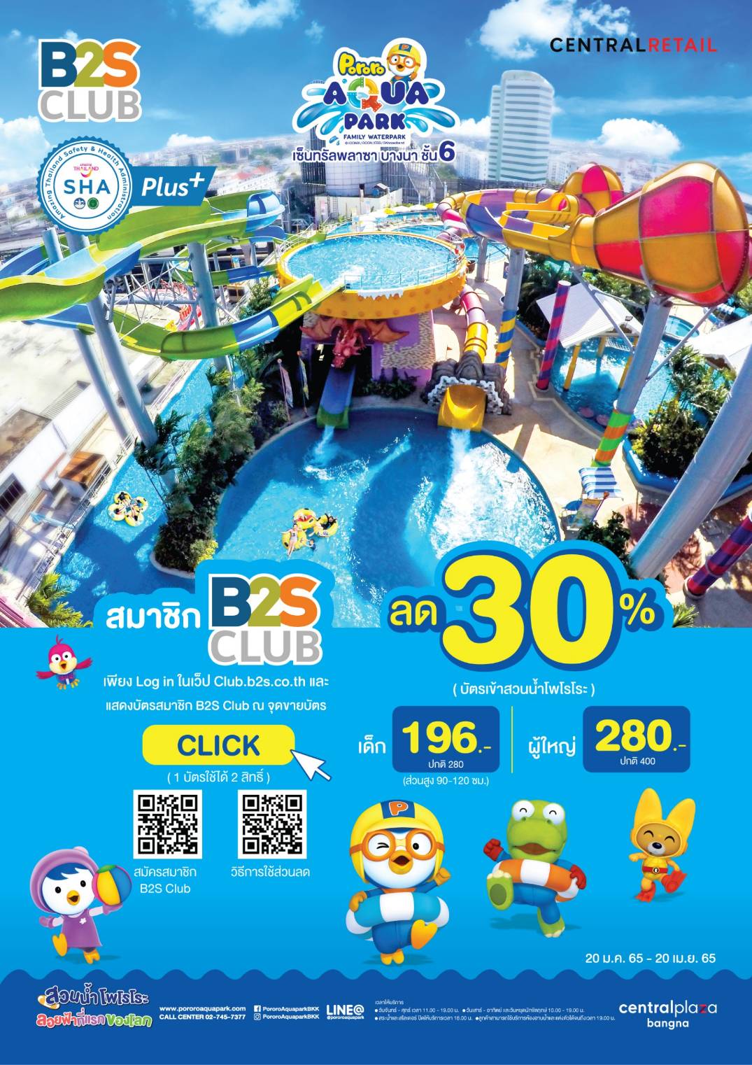 สมาชิก B2S CLUB แสดงบัตรสมาชิกรับส่วนลด 30% ที่สวนน้ำ Pororo