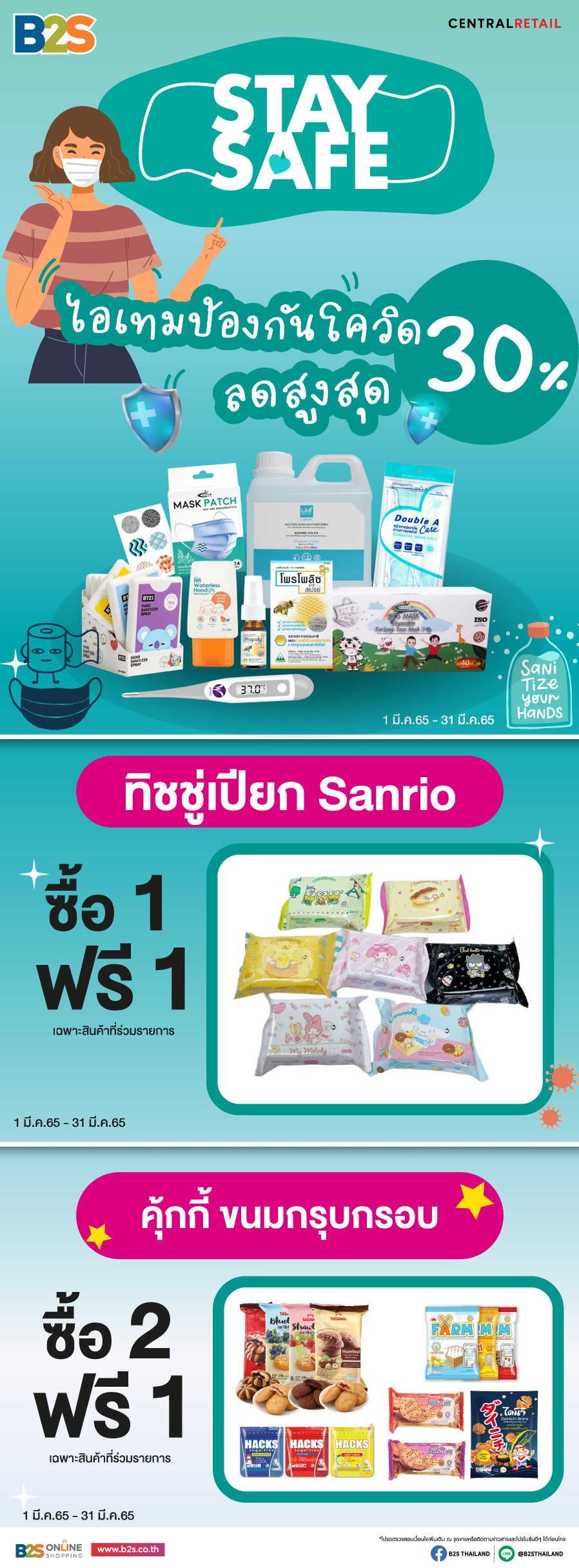 โปรโมชั่นประจำเดือนมีนาคม สินค้าป้องกันโควิด ลดสูงสุด 30% ที่ B2S เท่านั้น