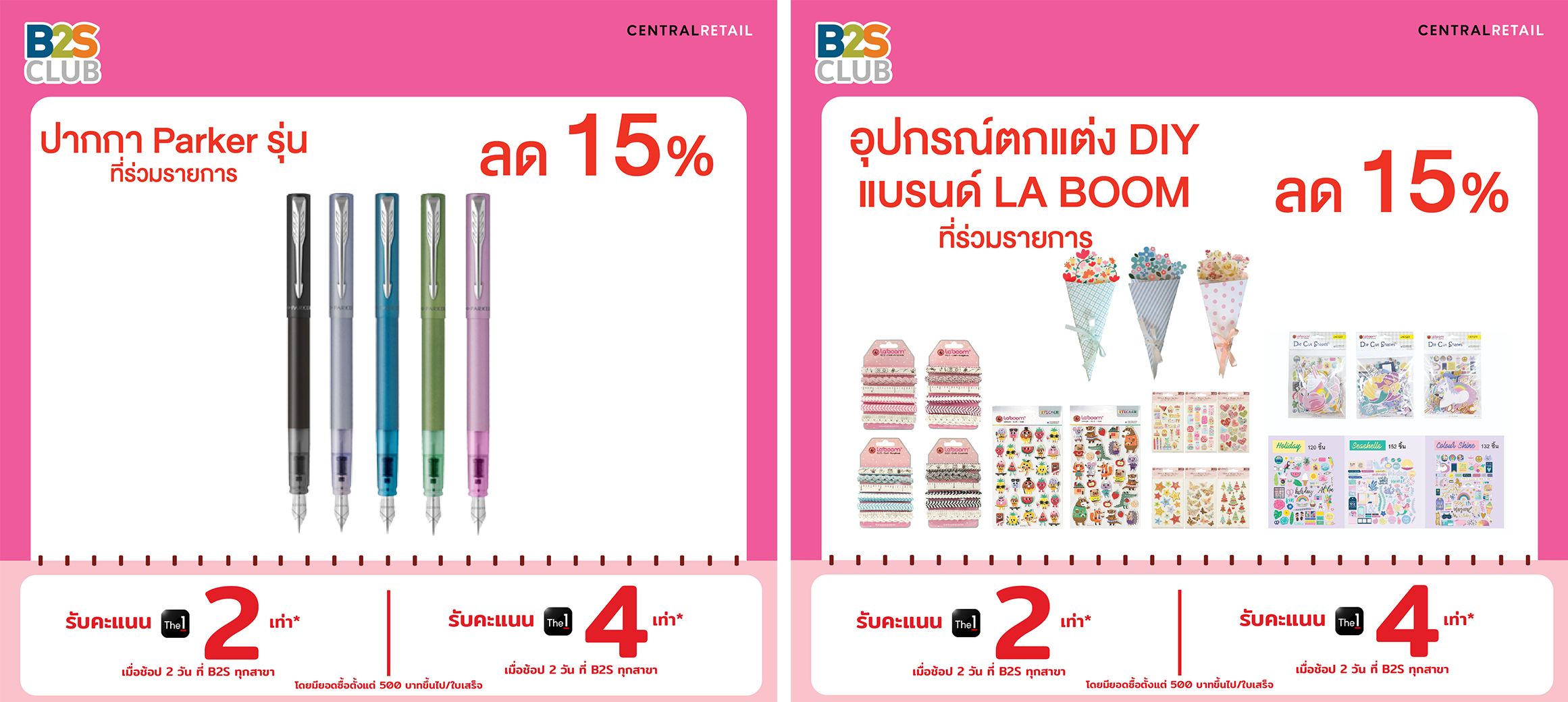 • รับคะแนน The 1 2 เท่า เมื่อช้อป 2 วัน ที่ B2S ทุกสาขา โดยมียอดซื้อตั้งแต่ 500 บาทขึ้นไป/ใบเสร็จ