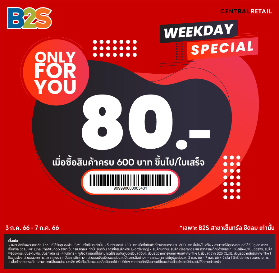 Weekday Special! รับส่วนลดพิเศษเฉพาะคุณ 80 บาท* เฉพาะ B2S สาขา เซ็นทรัล ชิดลม เท่านั้น