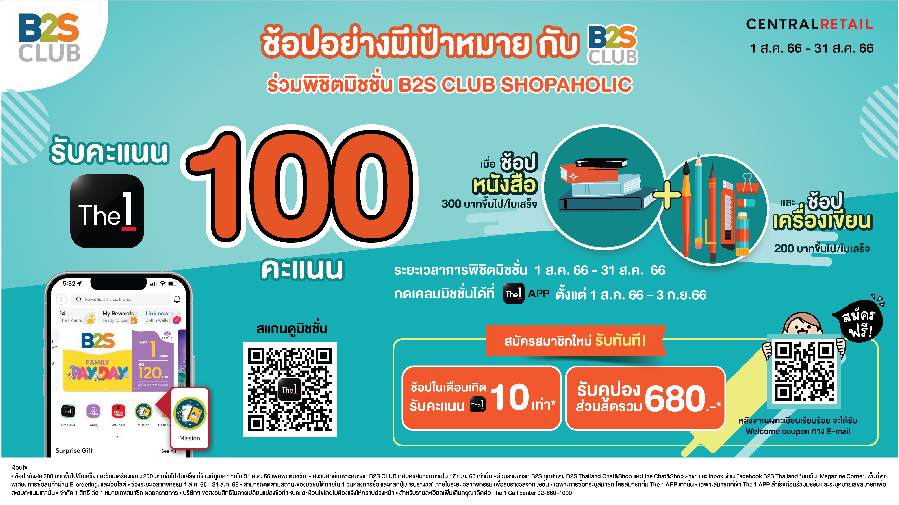 คุณพ่อคุณแม่สมาชิก B2S CLUB รับสิทธิ์ซื้อสินค้าราคาสมาชิกลด 50% และชวนพิชิตมิชชั่นรับคะแนนThe1 100 คะแนน