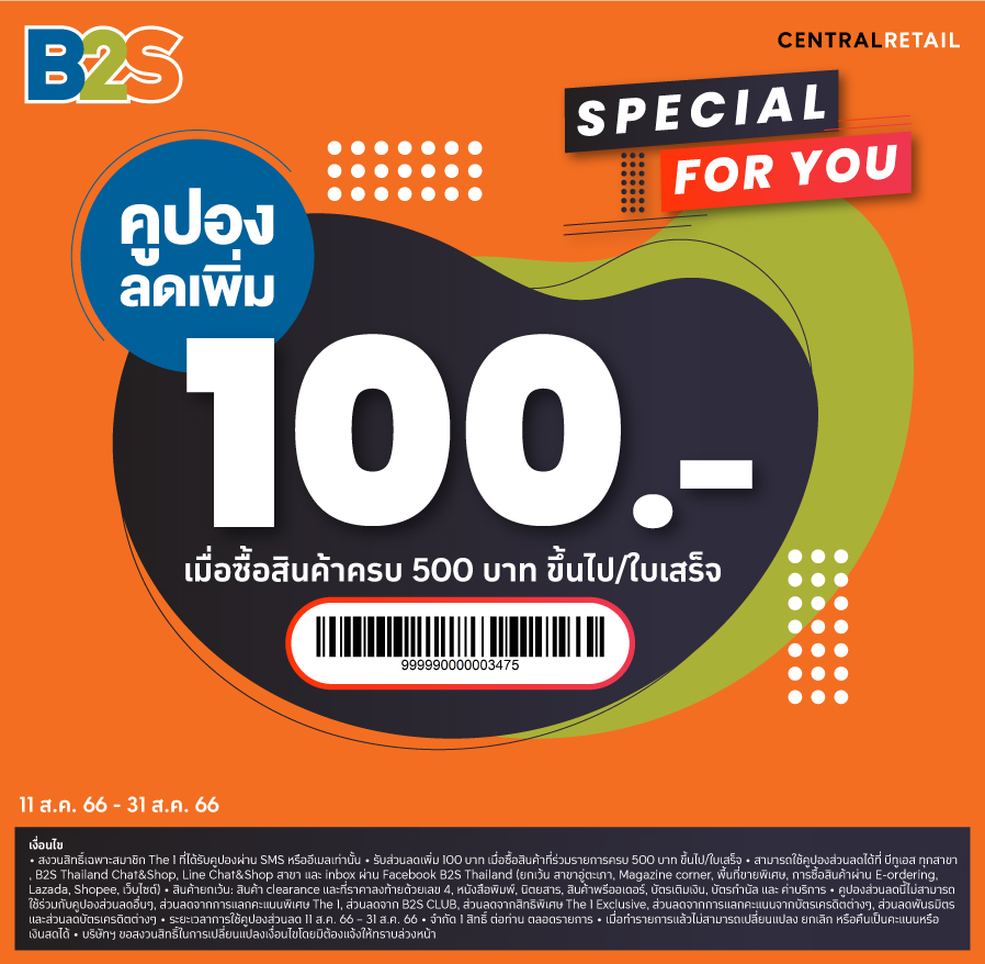 รับเลย! คูปองลดเพิ่ม 100 บาท* ไว้ช้อปสินค้าใหม่สุดฮิตราคาพิเศษ ที่ B2S ทุกสาขา ถึง 31 ส.ค. 66