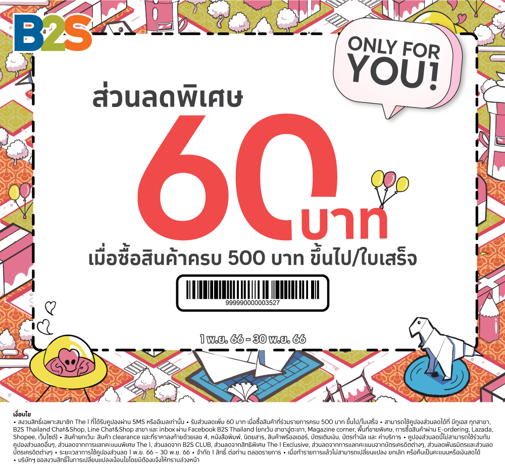 คูปองส่วนลดพิเศษ 60 บาท* ไว้ช้อปสินค้าใหม่สุดฮิตราคาพิเศษ ที่ B2S ทุกสาขา ถึง 30 พ.ย. 66