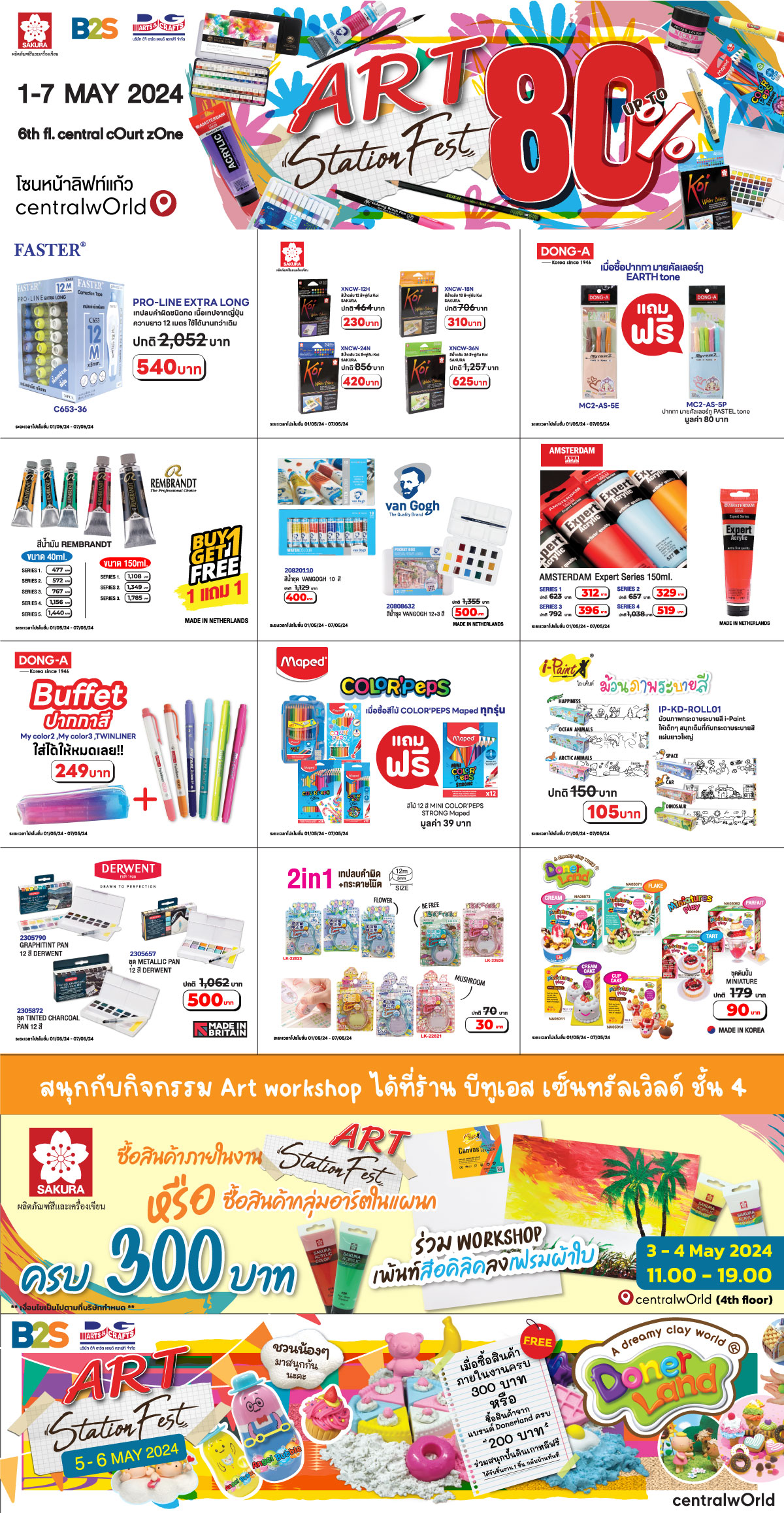 เงื่อนไข : เมื่อซื้อสินค้าภายในงาน DG ART X SAKURA Art Station Fest Up to 80% สาขา เซ็นทรัลเวิล์ด ชั้น 6 หรือซื้อสินค้ากลุ่มอาร์ตในแผนก B2S ครบ 300 บาท เข้าร่วมฟรี ‼️ พร้อมรับผลงานกลับบ้านได้เลย